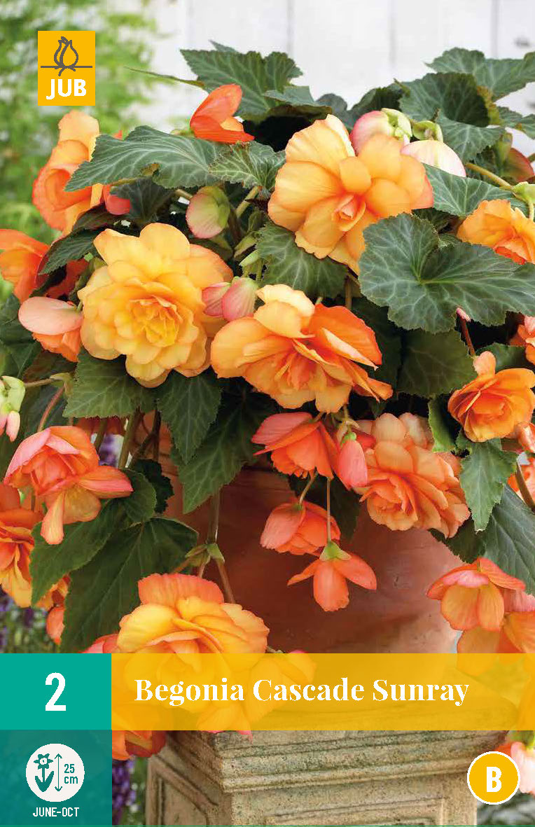Oranžsarkanās kaskādes begonijas 'Sunray' var apbrīnot mēnešiem ilgi, un tās ir īstas vasaras un rudens ziedētājas. Begonijas ir viegli kopjamas un tām nepieciešama neliela uzmanība. Kaskādes begonijas izskatās skaisti puķu podos uz balkoniem vai terasēm, kā arī dārzā starp īsākiem viengadīgiem augiem. Labākais begoniju stādīšanas laiks ir pavasaris, pēc tam, kad ir pagājušas salnu briesmas. Stādiet bumbuļus ar ieliektām pusēm uz augšu, apmēram 20 cm attālumā vienu no otra, un pārklājiet tos ar plānu augsnes kārtu. Begonijas var viegli pārziemot, ja ievērojat nepieciešamos piesardzības pasākumus. Iesakām izrakt bumbuļus, kad tiek prognozētas pirmās salnas. Uzglabājiet tos sausā vietā pārziemojot. Pavasarī, kad vairs nav salnu riska, begonijas var stādīt atpakaļ dārzā. Begonijas dod priekšroku daļējai ēnai. Tomēr, ja begonijas atrodas pilnā saulē, noteikti tās bagātīgi laistiet (apmēram 2–3 reizes nedēļā). Laistiet augus pēcpusdienā pēc tam, kad spožā saule ir pazudusi.