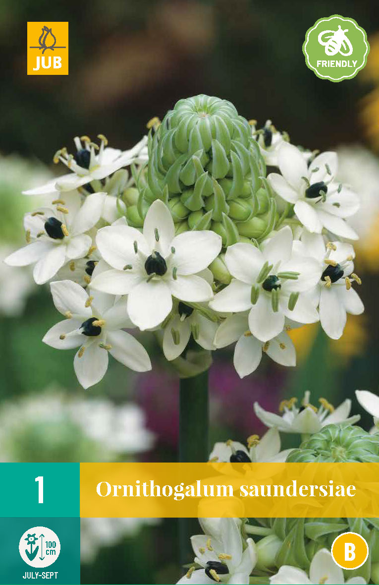 Ornithogalum saundersiae veido ziloņkaula baltu, zvaigžņveida ziedu puduri uz augstiem kātiem. Augstums 100 cm. Ziedēšanas periods: no jūlija līdz septembrim.